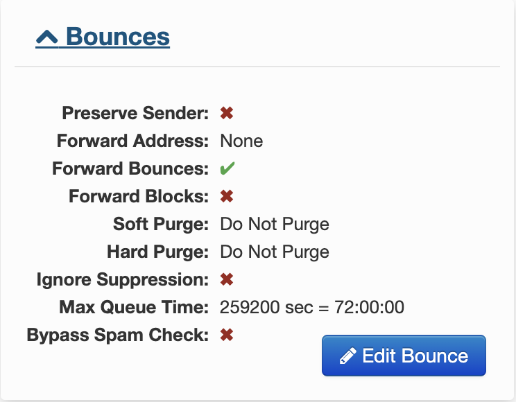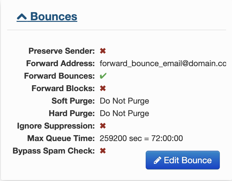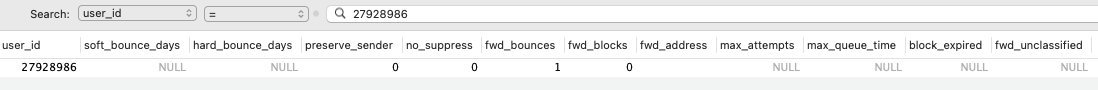 In MySQL, information about Bounce settings can be found under the Mail Settings DB > bounce_management table.